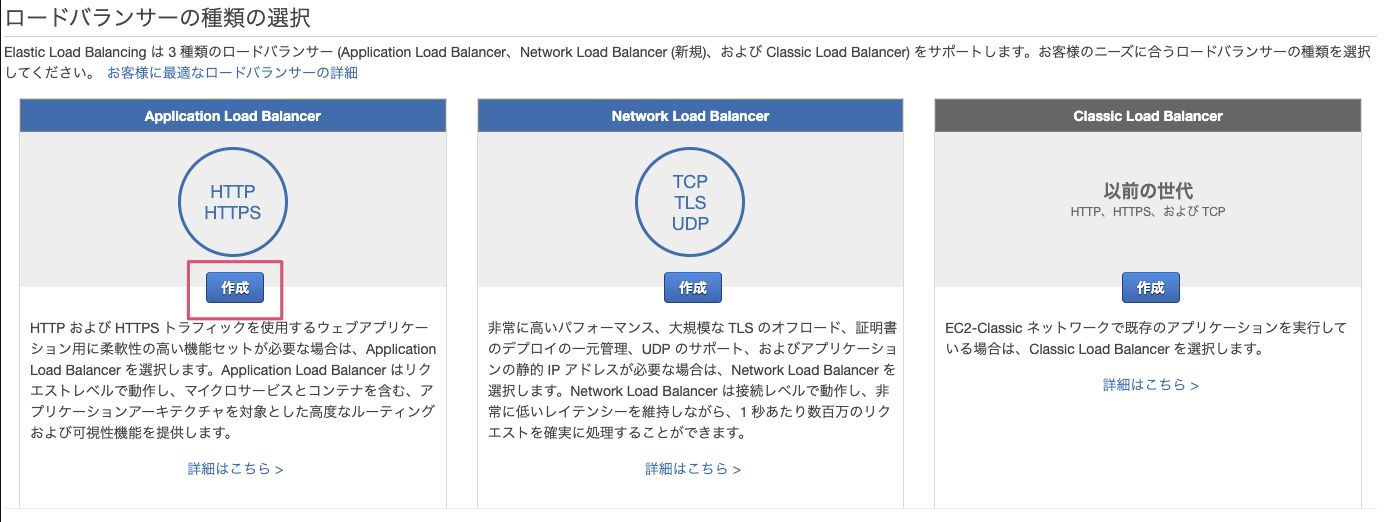 『Application Load Balancer』の『作成』を選択します。