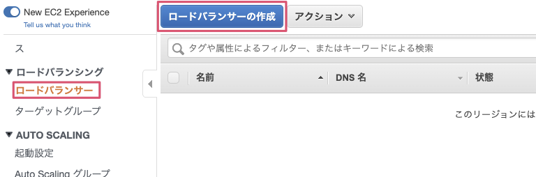 『EC2ダッシュボード』を開き、『ロードバランサー』→『ロードバランサーの作成』を選択します。