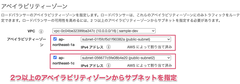 ALBを配置する際は2つ以上のアベイラビリティゾーンからサブネットを指定する必要があります。