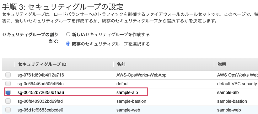 セキュリティグループは『既存のセキュリティグループを選択する』をチェックし、事前に作成したsample-albを選択してください。