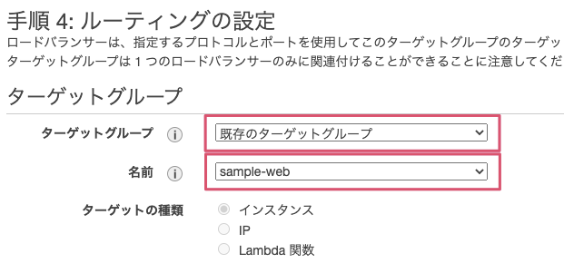 ルーティングの設定については、ターゲットグループは『既存のターゲットグループ』、名前は先ほど作成したsample-webを選択します。