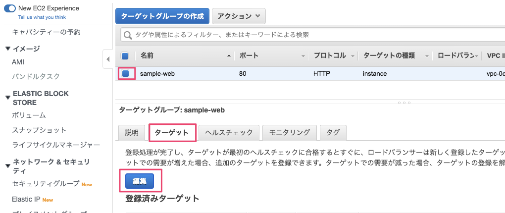 先ほど作成したターゲットグループをチェックし、『ターゲット』タブの『編集』を選択します。