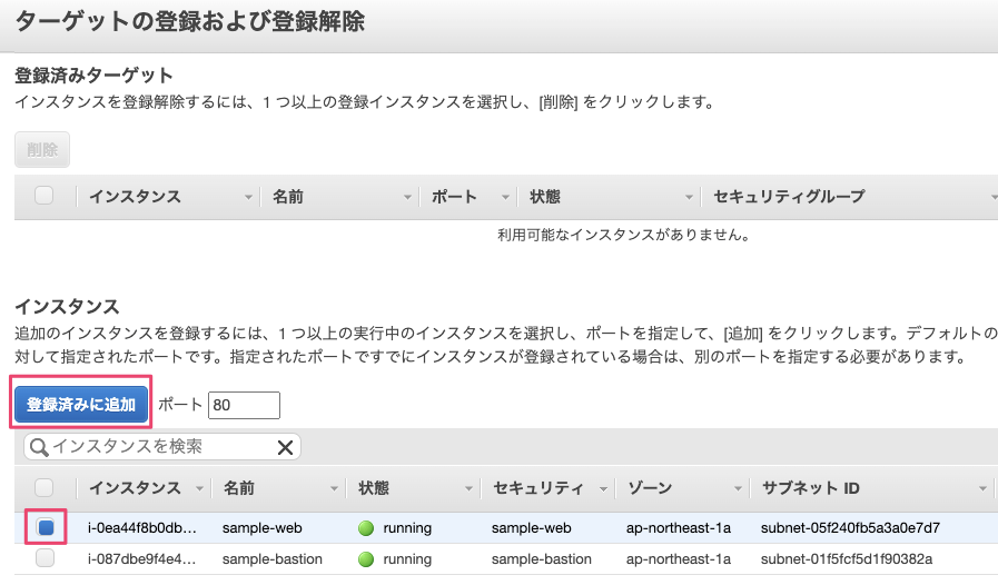 ターゲットグループに紐づけるEC2にチェックをし、『登録済みに追加』を選択します。