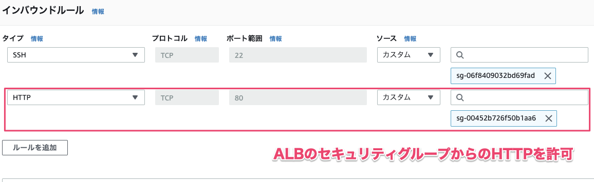 Webサーバーのセキュリティグループの『インバウンドルール』にALBのセキュリティグループからのHTTP通信を許可する設定を追加します。