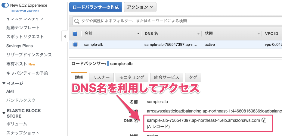 ALBのDNS名はALBの詳細で確認できます。