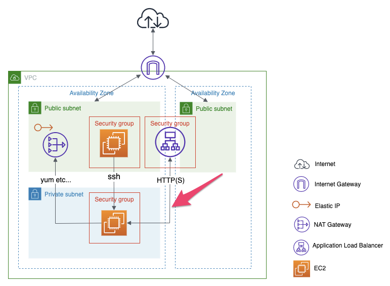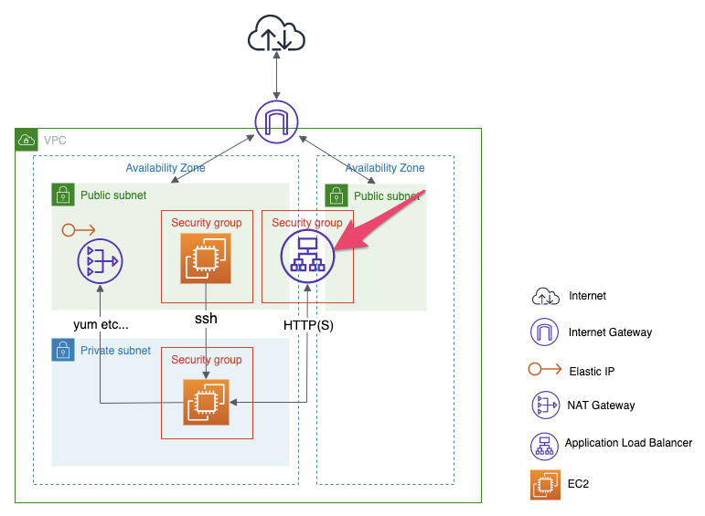 ALBを利用する場合HTTPアクセスはALB経由で行われるため、Webサーバーは直接インターネットとつながっている必要はありません。