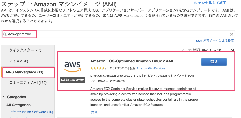 『AWS Marketplace』を選択し、検索バーに『ecs-optimized』と入力して表示されるAMIを利用します。1 今回はAmazon ECS-optimized AMIで推奨されている『Amazon ECS-optimized Amazon Linux 2 AMI 』を利用します。