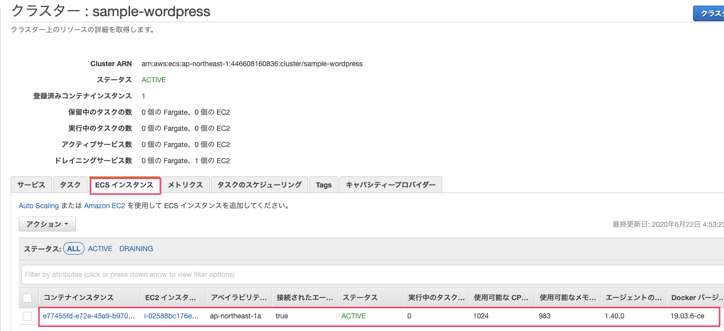 ECSインスタンス作成後、先ほど作成したクラスターの『ECSインスタンス』の一覧にインスタンスが表示されていればOKです。