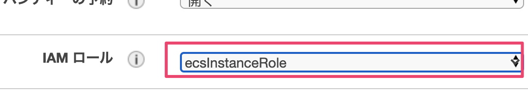 IAMロールは『ecsInstanceRole』を選択してください。適切なIAMロールが設定されていないと、ECSエージェントがクラスターに接続できないので注意しましょう。