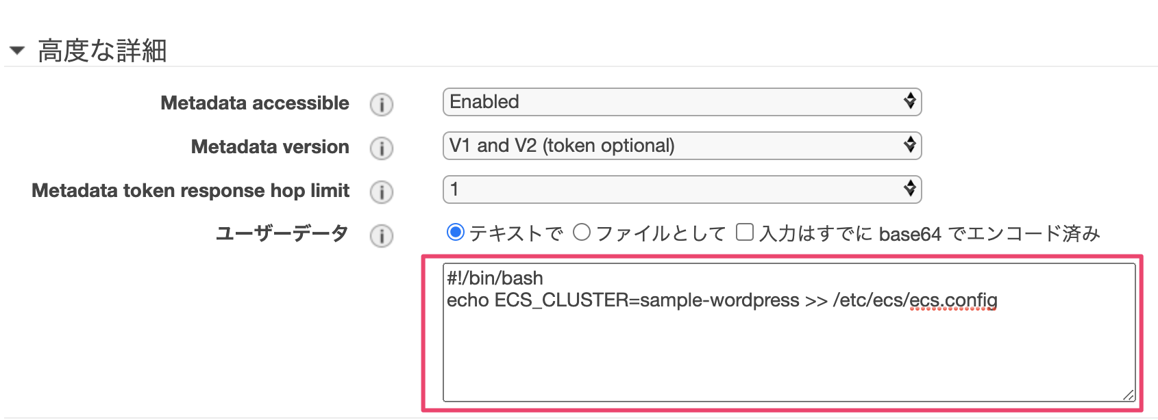 『高度な詳細』→ 『ユーザーデータ』の『テキストで』にチェックを入れ、テキストボックスに下記を入力します。