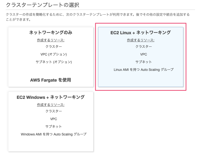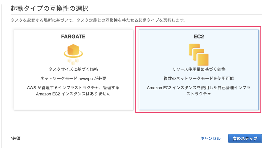 なお、ECSの実行環境はEC2を利用します。