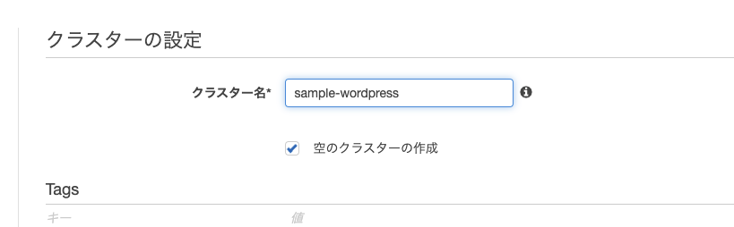 『空のクラスターの作成』にチェックを入れ、クラスター名を入力します。今回はsample-wordpressというクラスター名にします。