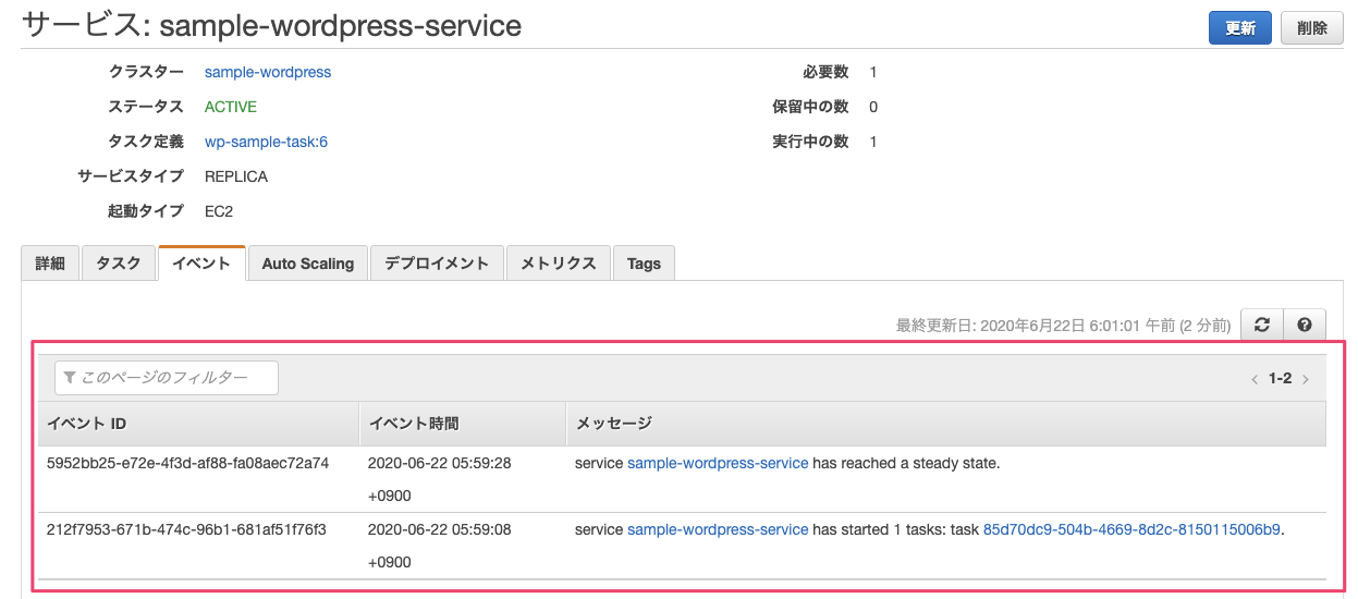 サービスの作成が完了するとサービスの設定をもとに、クラスターにタスクの配置が行われます。サービスのイベントログはサービスの『イベント』タブで確認できます。