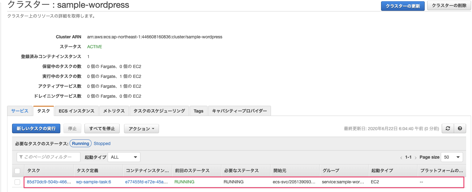 サービスが実行され、クラスターにタスクが配置されたことを確認してみます。クラスターの『タスク』を確認し、タスクが追加されていればOKです。