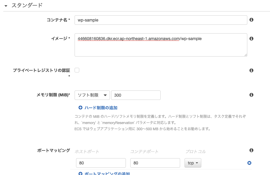 『メモリ制限』はAWSで推奨されている300MBを『ソフト制限』で設定しました。使用メモリが超えたら強制的にコンテナを終了させたい場合は『ハード制限』にしてください。