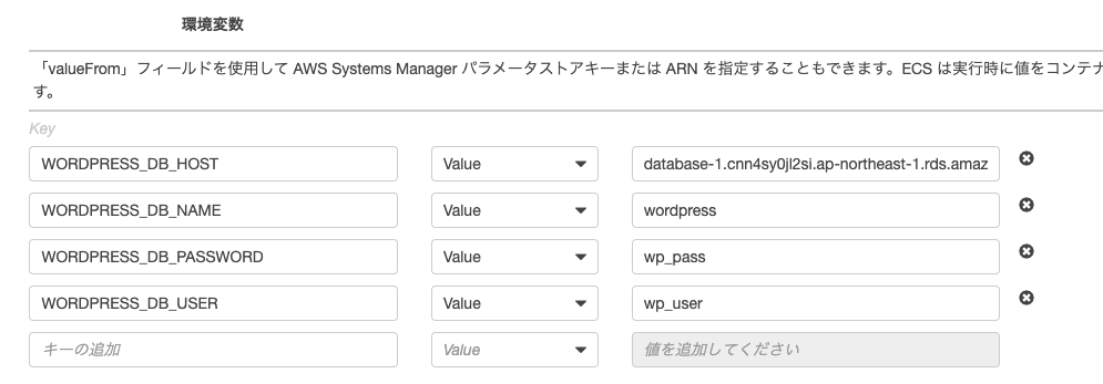 今回はRDSを利用するため、WordPressのデータベースホスト名はRDSのエンドポイントを指定しています。Dockerコンテナの環境変数でRDSのエンドポイントを指定することでECSとRDSの連携ができます。