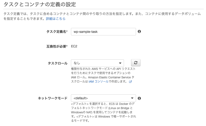 タスク定義とは、タスク内でのコンテナ間のやりとりの方法やコンテナ数、使用ポートといったコンテナ情報を明記したものです。