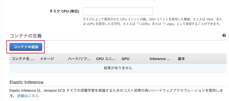次にタスク定義にコンテナを追加します。『コンテナの追加』を選択するとコンテナの設定画面が表示されます。