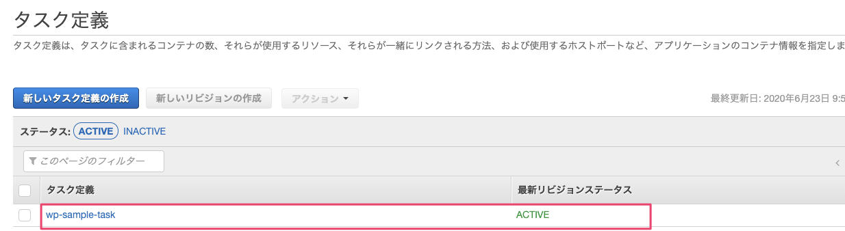 作成後、タスク定義一覧に先ほど作成したタスク定義が表示されていればOKです。