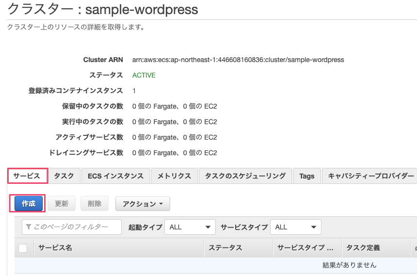 クラスターの『サービス』タブの『作成』を選択します。