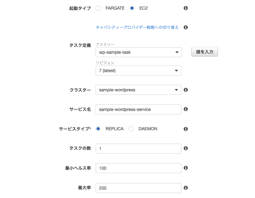 『サービスタイプ』はホストの増減に合わせてタスク数を制御するのであれば『DAEMON』、クラスター内でのタスク数を指定するのであれば『REPLICA』を指定します。今回はREPLICAにしました。