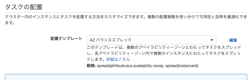『配置テンプレート』は、『スプレッド(spread)』にすると均一性を重視した配置戦略、『ビンパック(binpack)』にするとコンテナインスタンスの数を最小限に抑える配置戦略となります。詳細はAmazon ECS タスク配置戦略を参照してください。