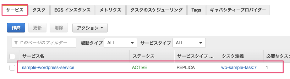 サービスを作成後、クラスターのサービス一覧にサービスが表示されていればOKです。