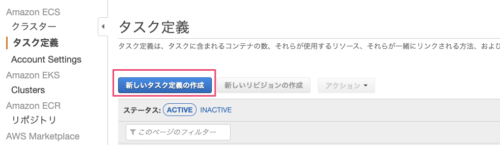 Amazon ECSの『タスク定義』→『新しいタスク定義の作成』を選択します。