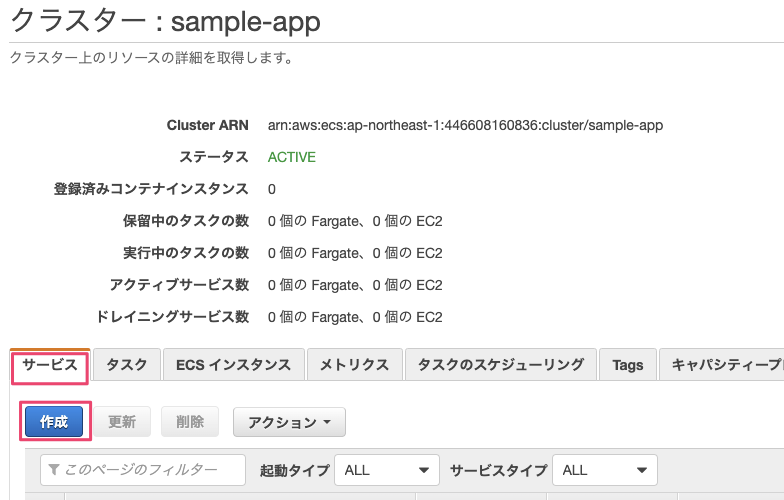 クラスターの『サービス』タブの『作成』を選択します。