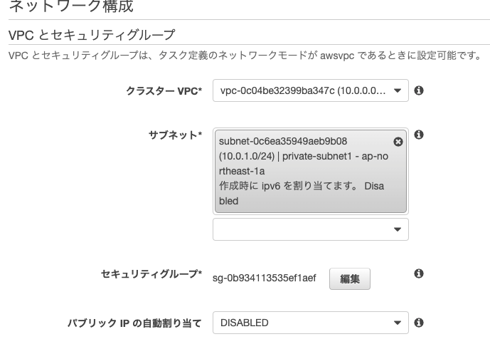 『VPCとセキュリティグループ』はタスクを配置するプライベートサブネットの情報を設定します。プライベートサブネットなので『パブリック IP の自動割り当て』は不要です。