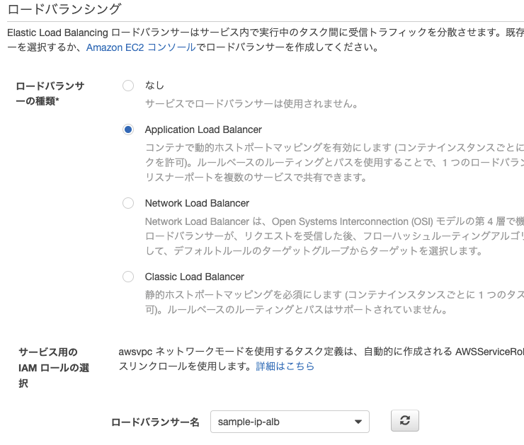 『ロードバランシング』はALBを選択し、事前に作成したロードバランサー名を指定します。