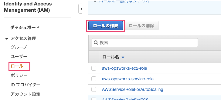 1 IAMダッシュボードの『ロール』→『ロールの作成』を選択します。