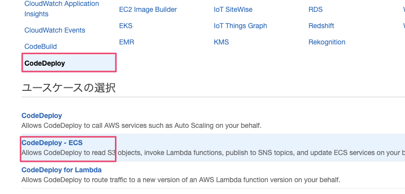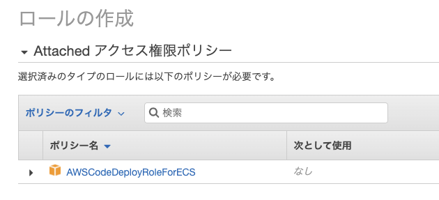 AWSCodeDeployRoleForECSが表示されるのでロールを作成します。