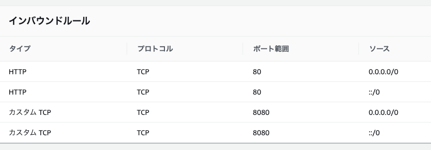 検証用のポートでもアプリケーションにアクセスできるようにするため、テストリスナーポートをロードバランサーのインバウンドルールに追加します。今回は8080を検証用のポートにしました。