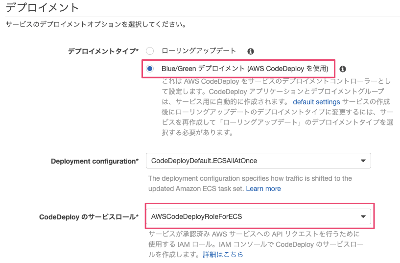 デプロイメントについて、『デプロイメントタイプ』は『Blue/Greenデプロイメント』を選択します。『CodeDeployのサービスロール』は事前に作成したAWSCodeDeployRoleForECSを指定します。