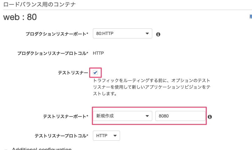 Blue/Greenデプロイメントでは、本番稼働しているポート(プロダクションリスナーポート)だけでなく、デプロイ前の検証用ポート(テストリスナーポート)の設定ができます。