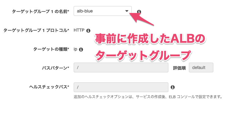 2 『ターゲットグループ1の名前』には事前に作成したALBのターゲットグループを指定します。今回はalb-blueというターゲットグループを事前に作成しておきました。