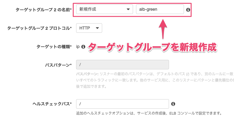 『ターゲットグループ2の名前』は新規作成をします。今回はalb-greenというターゲットグループ名にしました。