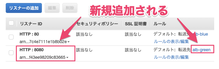 サービスの作成されると、ロードバランサーに新規リスナーポート(8080)と新規ターゲットグループ(alb-green)が追加されます。