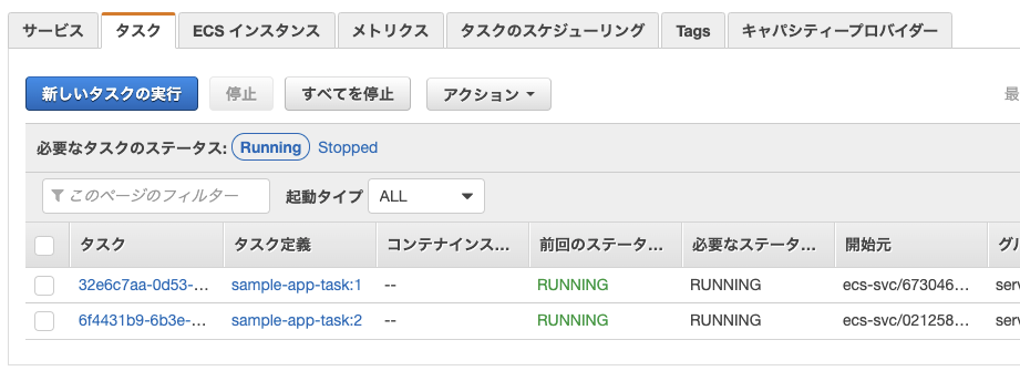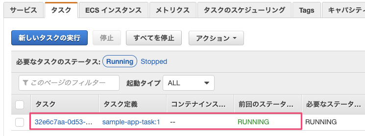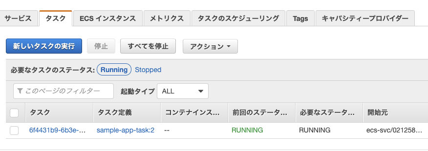 デプロイメントが正常に実行されるとタスク一覧にタスクが表示されます。今回はタスク数を1つにしたため、1つのタスクがRUNNING状態になっています。