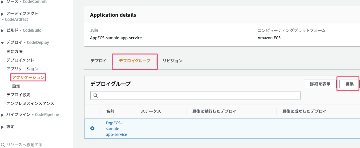 CodeDeployのダッシュボードにある『アプリケーション』の『デプロイグループ』の『編集』を選択します。