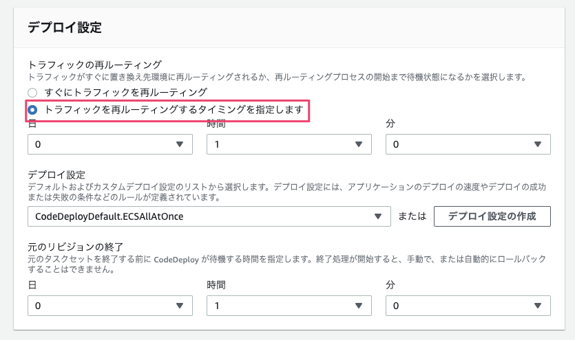 自動作成されたCodeDeployの設定では検証環境と本番環境のトラフィックの切り替えが即時反映されるようになっています。