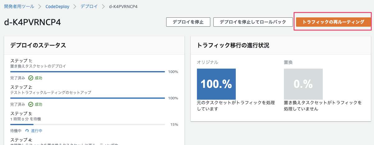 検証環境の確認が完了したらCodeDeployのデプロイ詳細にある『トラフィックの再ルーティング』を実行します。