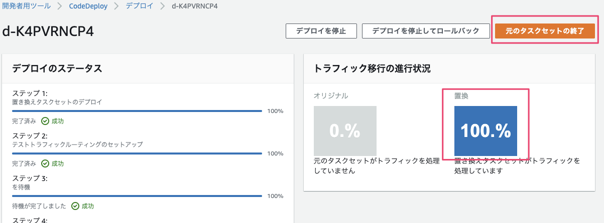 デプロイが正常に終了し、ロールバックの必要がないと判断したら『元のタスクセットの終了』を選択します。