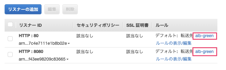 トラフィックの切り替えが完了しているため、ALBのターゲットグループは80ポートと8080ポートはalb-greenを向いていることがわかります。