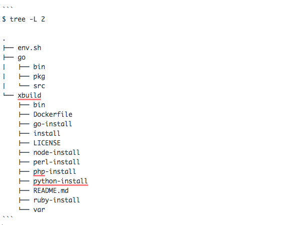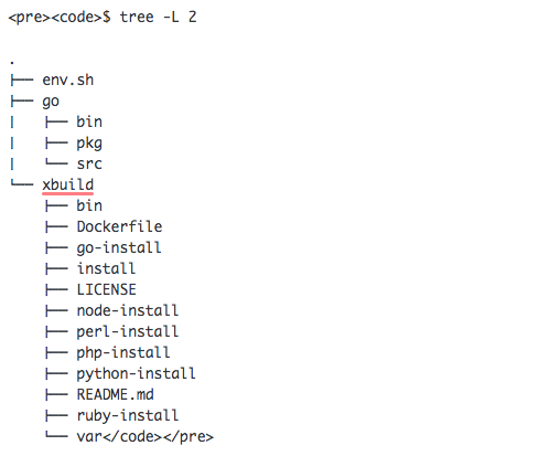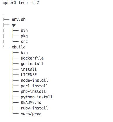 . ├── env.sh ├── go │ ├── bin │ ├── pkg │ └── src └── xbuild ├── bin ├── Dockerfile ├── go-install ├── install ├── LICENSE ├── node-install ├── perl-install ├── php-install ├── python-install ├── README.md ├── ruby-install └── var