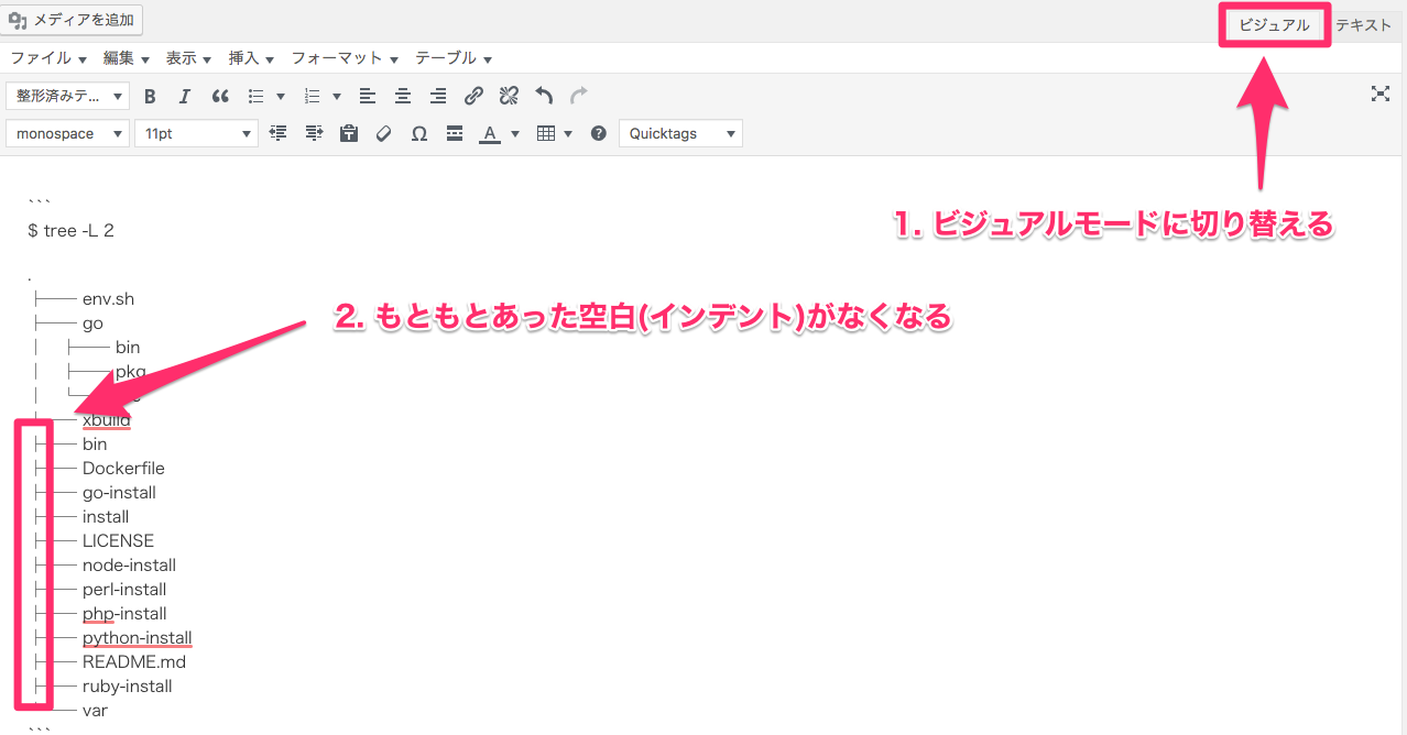 現状の問題点の確認: ビジュアルモードとテキストモードを入れ替えると自動整形がされる