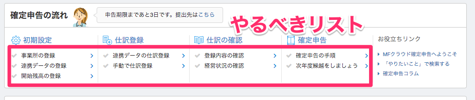 MFクラウドの画面を見てもらうとチェックリストが一覧で見れます。