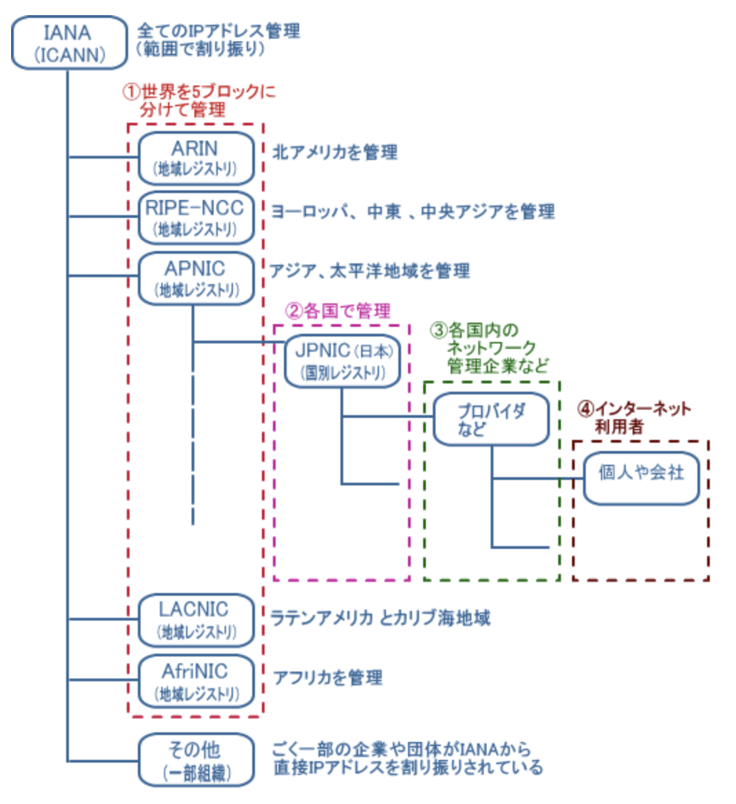 そして、IANAからさらに細かな機関にIPアドレスが分配され、そこからさらに細かな・・・という感じでウォーターフォール式にIPアドレスが振り分けられます。
