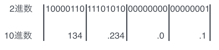 8ビット1組とし、4組に分けて10進数で表示して人でも わかりやすい形で表現されています。